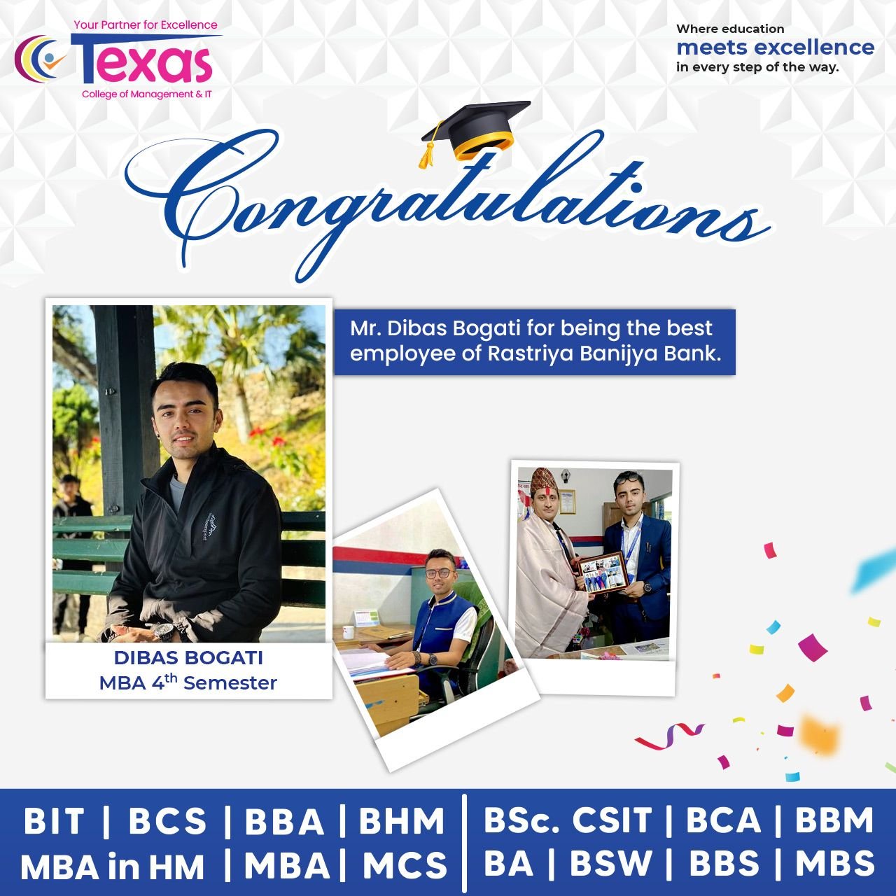 Congratulations to Mr. Dibas Bogati, our outstanding MBA 4th semester student, on being recognized as the Best Employee of Rastriya Banijya Bank. Your dedication and excellence are truly commendable.